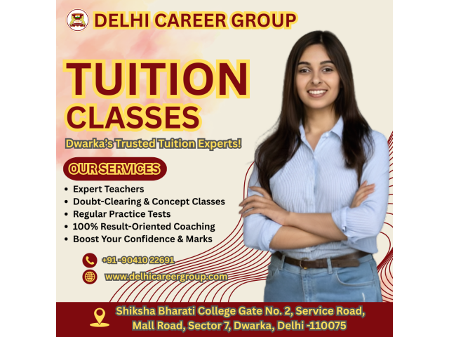 Tuition for Class 10 in Dwarka Delhi – Excel in your board exams with Delhi Career Group, the most trusted name for Class 10 tuition in Dwarka. Our expert teachers focus on conceptual clarity, regular practice, and individual attention to ensure every student achieves top results. We offer a supportive learning environment that builds confidence and strong fundamentals for future success.