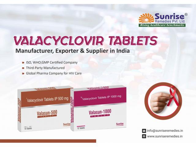 Sunrise Remedies is a top manufacturer of Valacyclovir 500mg and 1000mg under the brand name Valasun, which is designed by Sunrise Remedies Pvt. Ltd. based in Ahmedabad, Gujarat.